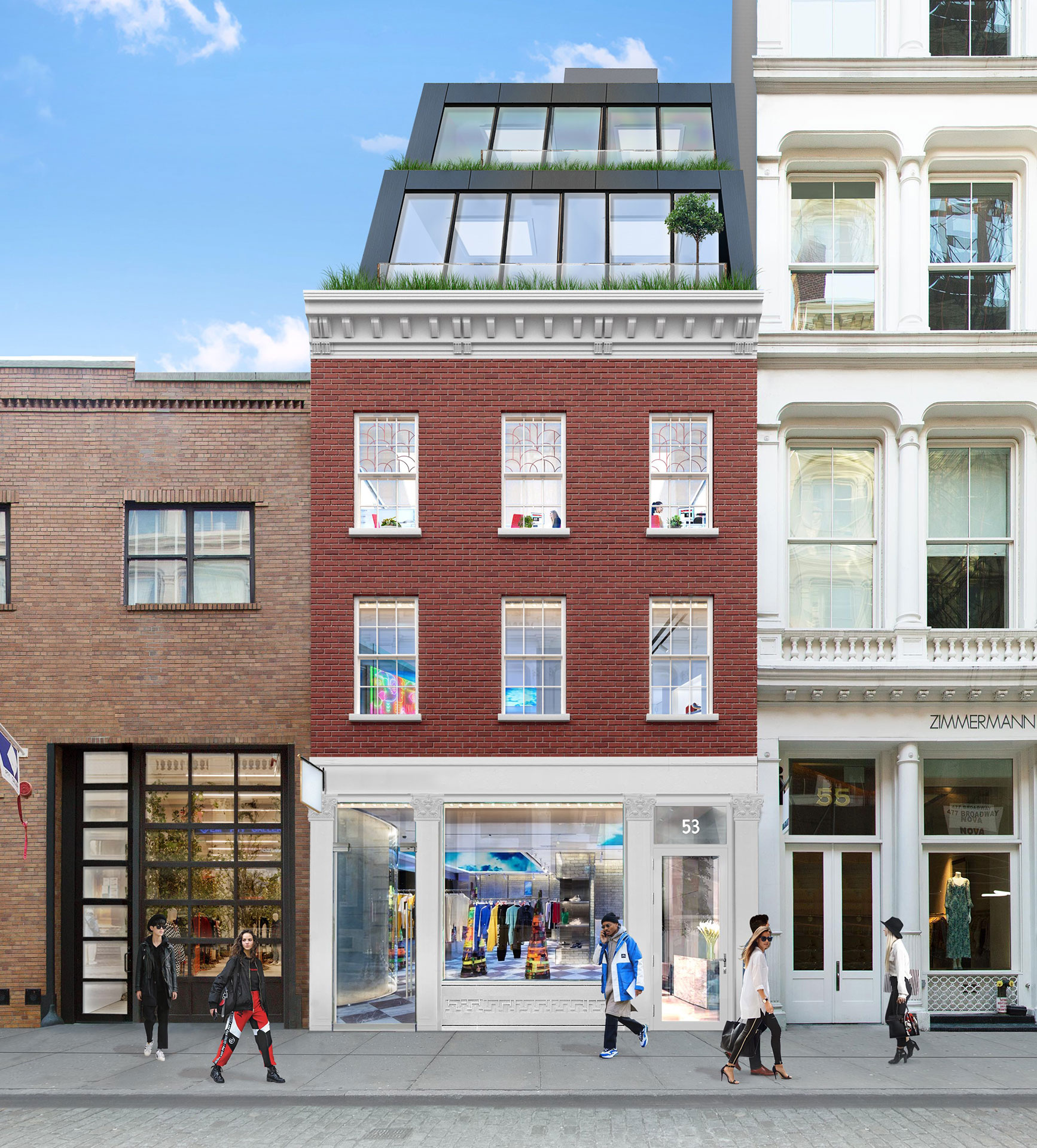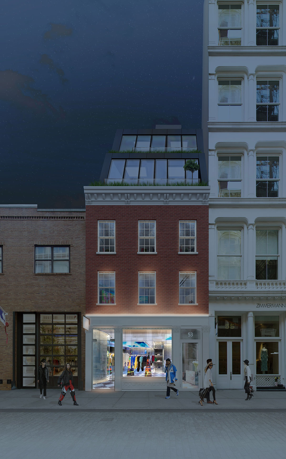 An existing landmark building renovated into high-end retail space, with a vertical expansion to include a penthouse. Tenantship includes Steve Madden, F.P. Journe, Goliath/Shady Records.